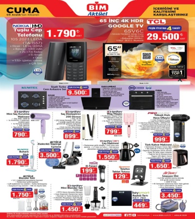 5 Aralık 2025 BİM aktüel kataloğu yayımlandı. Bu haftanın en çok dikkat çeken ürünü uygun fiyatıyla öne çıkan tuşlu Nokia cep telefonu oldu. Elektronikten ev tekstiline, mutfak ürünlerinden oyuncaklara kadar onlarca üründe büyük indirim var.
